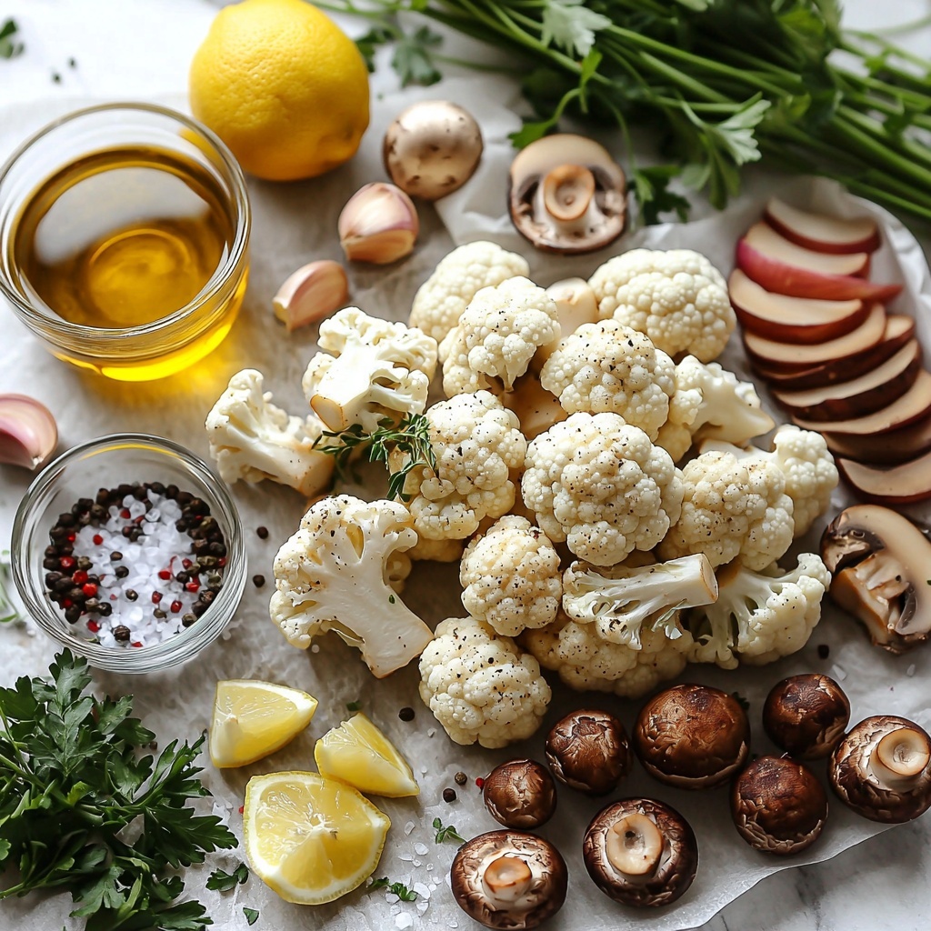 Start by cutting your cauliflower into small, bite-sized florets so each piece cooks evenly and makes for easy eating. Give your cremini mushrooms a gentle rinse to remove any dirt, then slice them to release their full flavor. Mince your garlic cloves finely to bring out their aromatic qualities that marry beautifully with both vegetables.