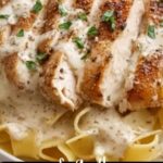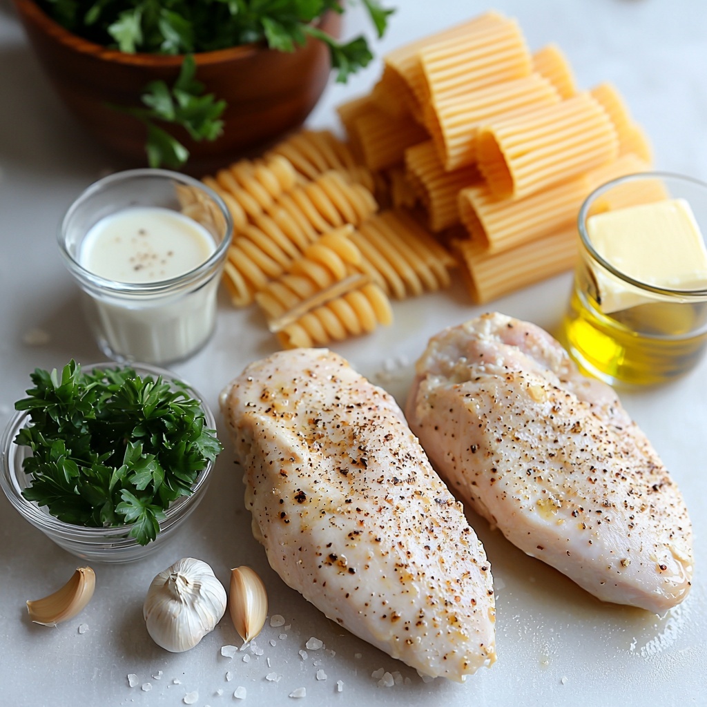 This Garlic Parmesan Chicken with Creamy Rigatoni Pasta is a comforting and delicious dish featuring tender, seasoned chicken breasts seared to perfection and served over rigatoni coated in a rich, creamy Parmesan sauce infused with garlic and Italian herbs. Perfect for a satisfying weeknight dinner, it combines simple ingredients to create a flavorful, hearty meal.