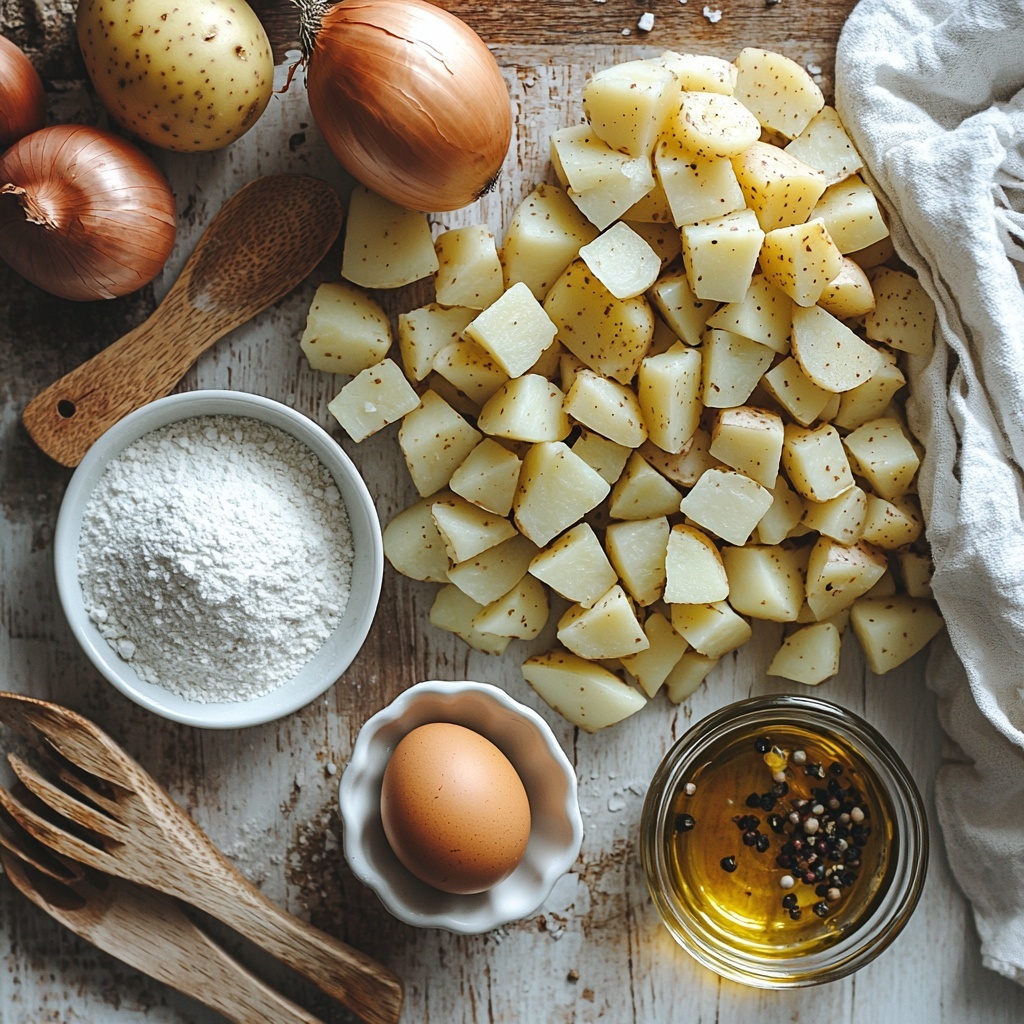 The beauty of this German Potato Pancakes (Kartoffelpuffer) Recipe lies in its straightforward and essential ingredients, each playing a key role in creating the perfect texture, flavor, and appearance. From the earthy potatoes to the aromatic onion and the crisping power of oil, every component counts.