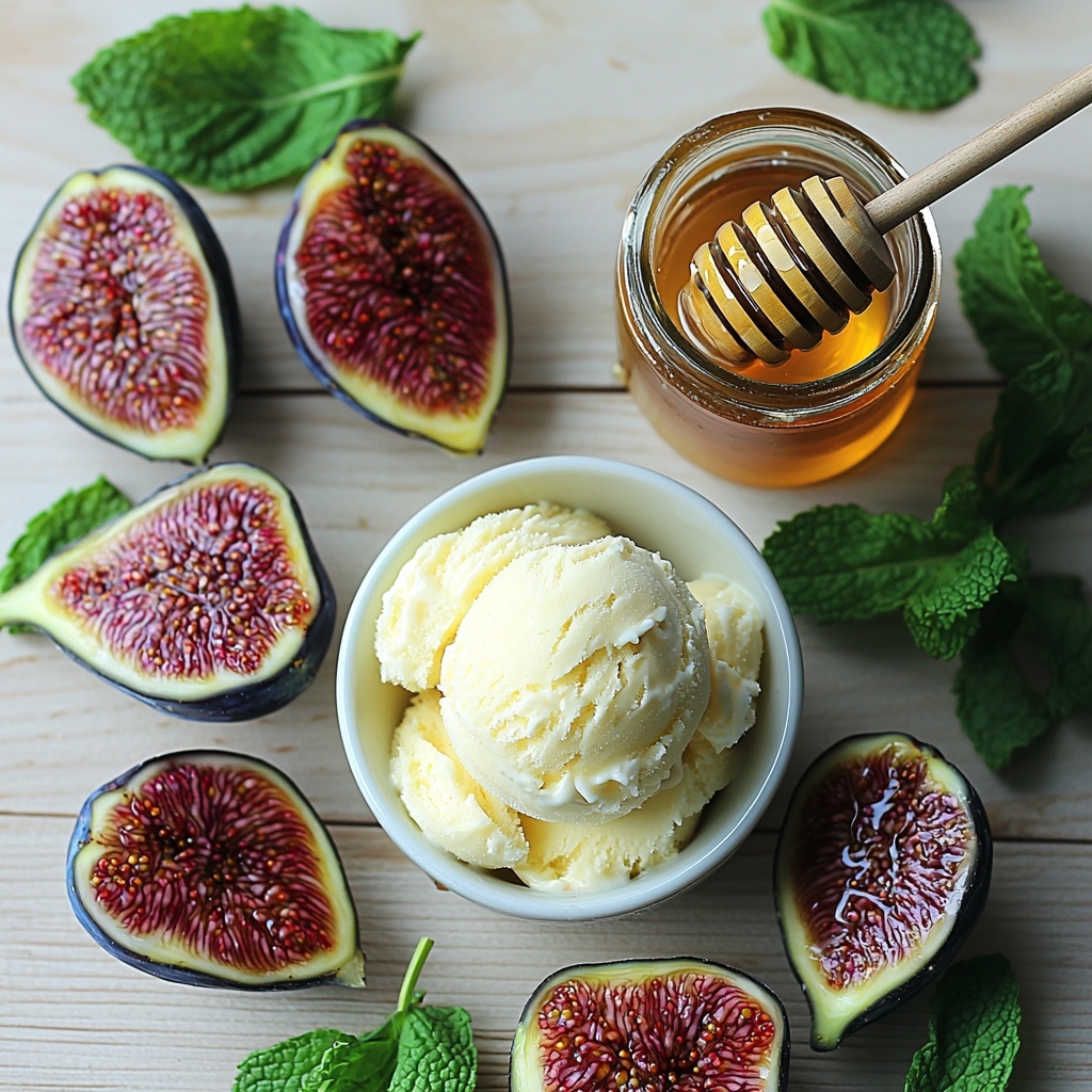 A sophisticated and easy-to-make gourmet dessert featuring fresh ripe figs paired with creamy vanilla ice cream, drizzled with organic honey and garnished with fragrant mint leaves for a refreshing treat perfect for any occasion.