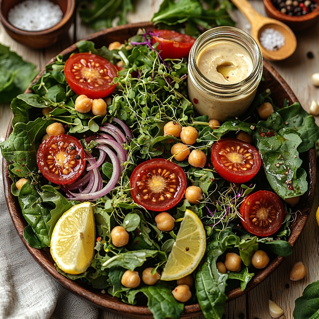 A fresh and vibrant green salad featuring a crisp spring mix, juicy cherry tomatoes, and protein-rich chickpeas, all brought together with a creamy, tangy lemon tahini dressing. This quick and easy recipe is perfect for a light lunch or a nutritious side dish.