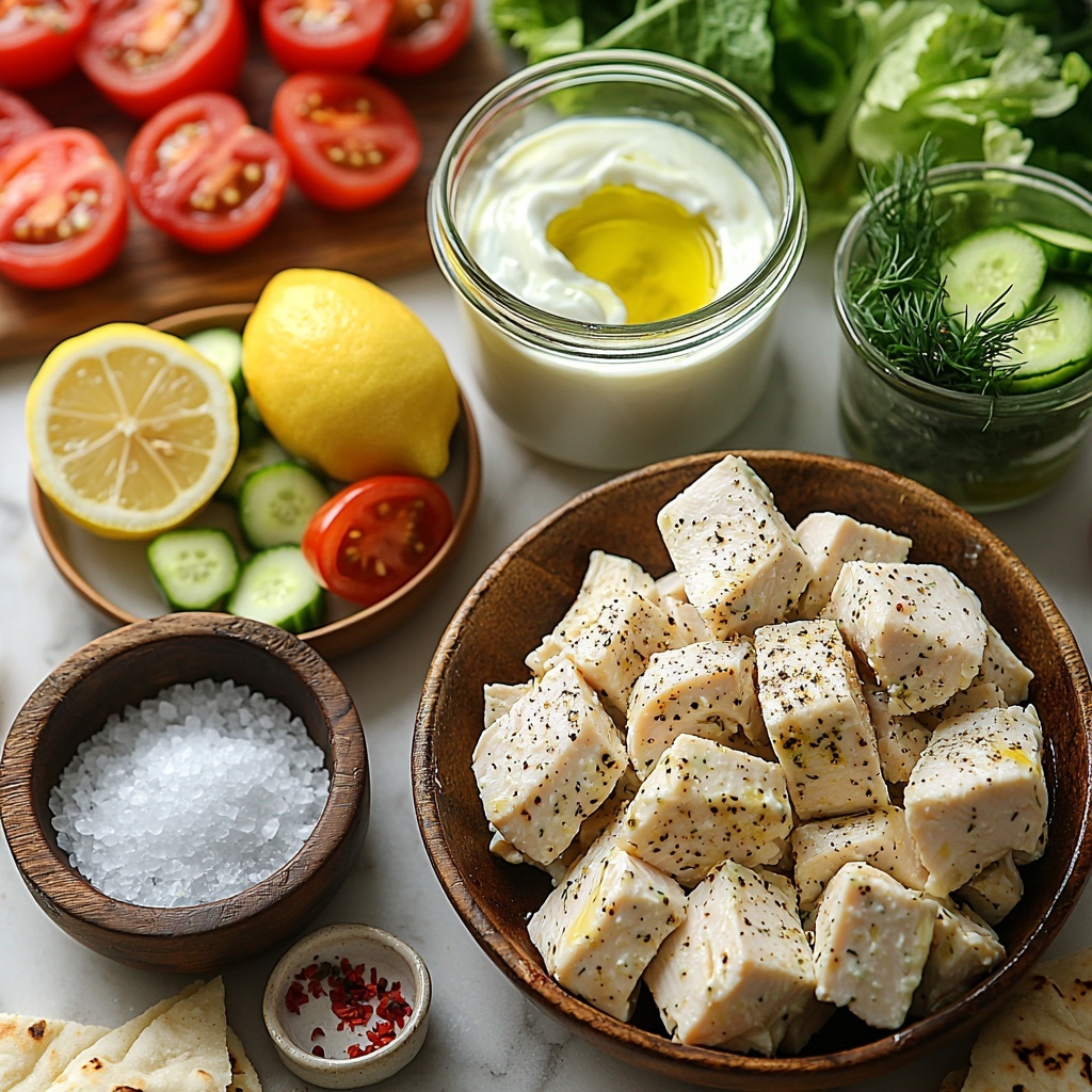 This Grilled Chicken Souvlaki with Tzatziki and Fresh Veggies Recipe calls for straightforward, wholesome ingredients that come together to create complex flavors and varied textures. Each element plays a crucial part, from the tangy lemon and aromatic garlic in the marinade to the refreshing dill in the tzatziki, making this meal as colorful as it is delicious.
