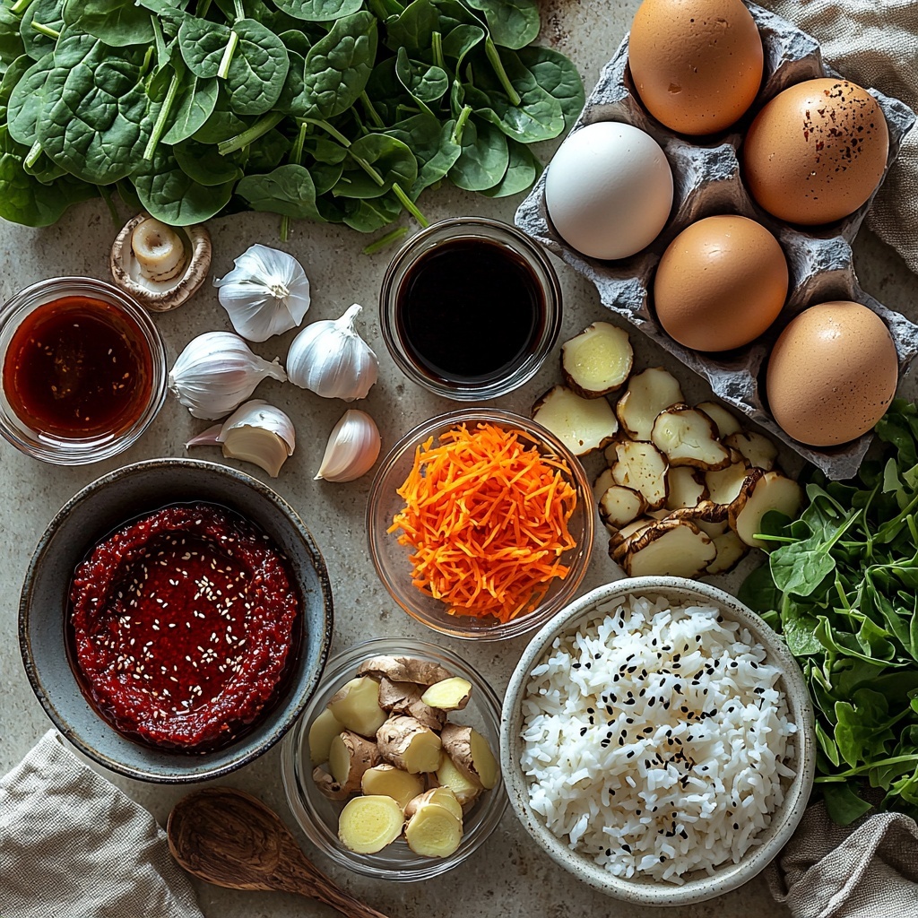 Immediately toss in the sliced shiitake mushrooms, chopped garlic, and grated ginger, stirring everything together. Cook until the mushrooms begin to release their moisture, about 5 minutes. Then add the grated carrots and chopped spinach to the skillet. Cook for another 3 minutes or until the spinach wilts down nicely. Pour in the gochujang sauce you set aside and stir everything to fully incorporate those wonderful flavors. Once mixed, remove the skillet from the heat.