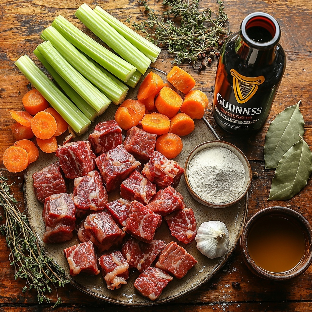 A hearty and flavorful Guinness Beef Stew featuring tender chunks of slow-simmered beef in a rich, thickened sauce made with Guinness beer, aromatic vegetables, and herbs. Perfect for cozy dinners, this stew offers a comforting blend of deep flavors and a velvety texture.