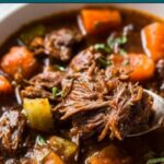 The beef should be fork-tender and almost falling apart after the long simmer. If you can easily pierce it with a fork and it feels very soft, it’s ready. The long cooking time helps collagen break down, giving the stew that luscious texture.