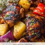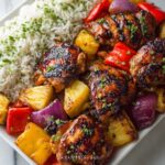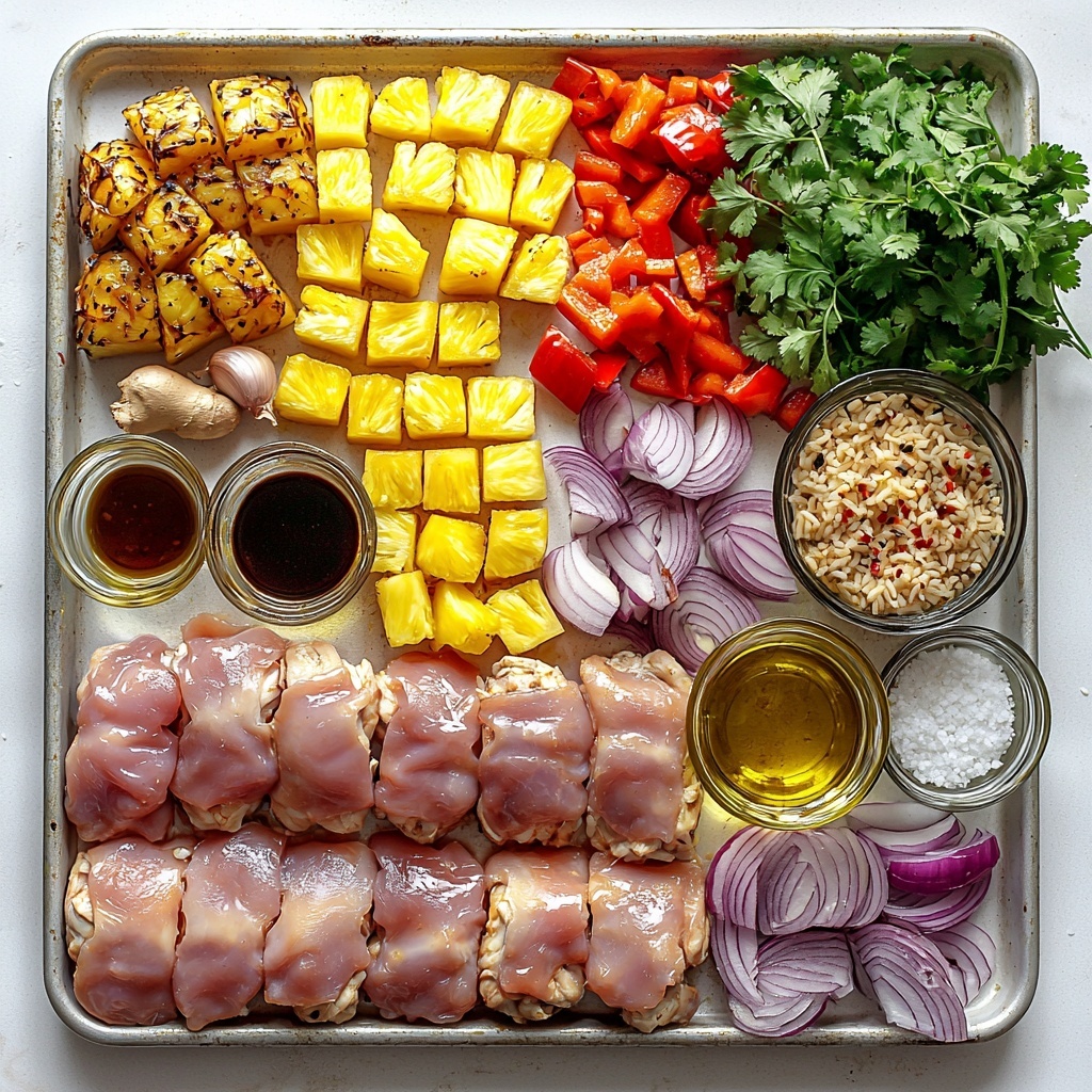 This Hawaiian Chicken Sheet Pan recipe combines tender, juicy chicken thighs with sweet pineapple chunks and colorful bell peppers, all roasted together for a flavorful one-pan meal. The chicken is marinated in a tangy, slightly sweet soy-based sauce with garlic, ginger, and smoked paprika, then baked to perfection with a glossy glaze finish, making it perfect for a quick and delicious dinner served over rice.