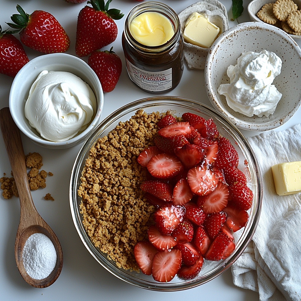 The magic of this recipe lies in its simple, thoughtfully chosen ingredients that each bring something special to the table. From the crunchy crust to the creamy cheesecake and the vibrant strawberry topping, every element plays a vital role in creating those perfect bars.
