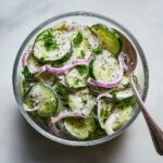 Start by thinly slicing the cucumbers so every forkful is delightfully crisp. Then, finely slice the red onion to balance the cool cucumbers with a subtle kick. If you prefer a milder tone, green onions are a fantastic substitute. Preparing these fresh veggies is the foundation of the salad’s refreshing vibe.