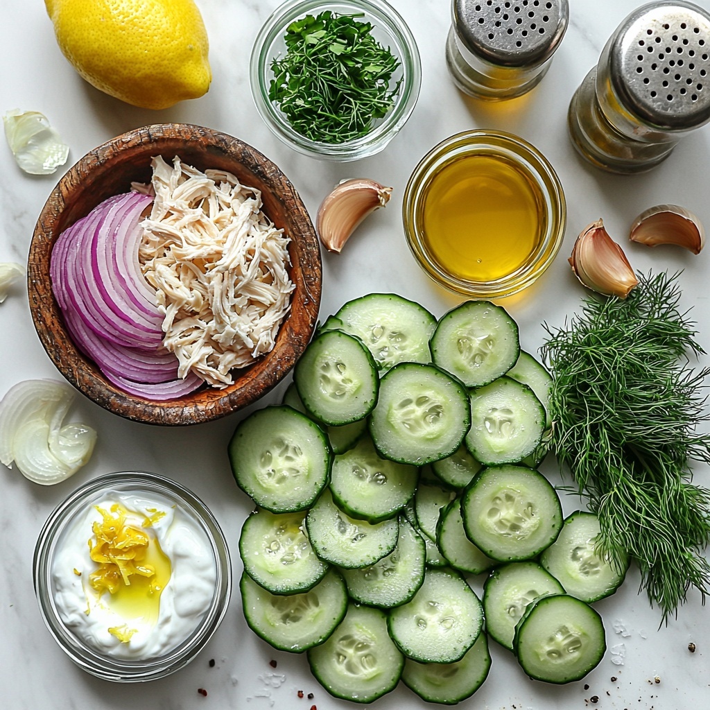 A refreshing and high-protein cucumber salad perfect for a light meal or side dish. This salad combines crisp cucumbers and red onions with lean chicken breast and creamy Greek yogurt, enhanced with fresh herbs, lemon juice, and garlic for a bright and satisfying flavor.