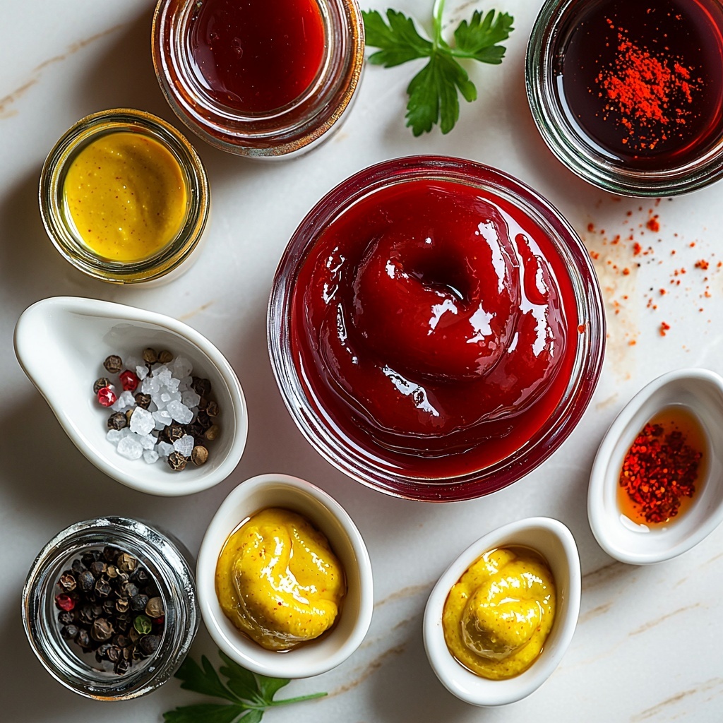 Start by gathering all your ingredients in a small saucepan. Pour in the ketchup, yellow mustard, Worcestershire sauce, and apple cider vinegar, then add the hot sauce, salt, ground pepper, and cayenne pepper. Give everything a good stir so the flavors start coming together beautifully before the heat is introduced.