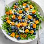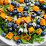 Once your sweet potatoes have finished roasting and are slightly cooled but still warm, it’s time to assemble. In a shallow bowl, combine the fresh arugula, juicy blueberries, crumbled goat cheese, pine nuts, and pepitas. Add the roasted sweet potatoes on top and drizzle about one teaspoon of your homemade honey lemon vinaigrette over everything. Toss gently if you prefer or serve as is to enjoy each layered bite distinctly.