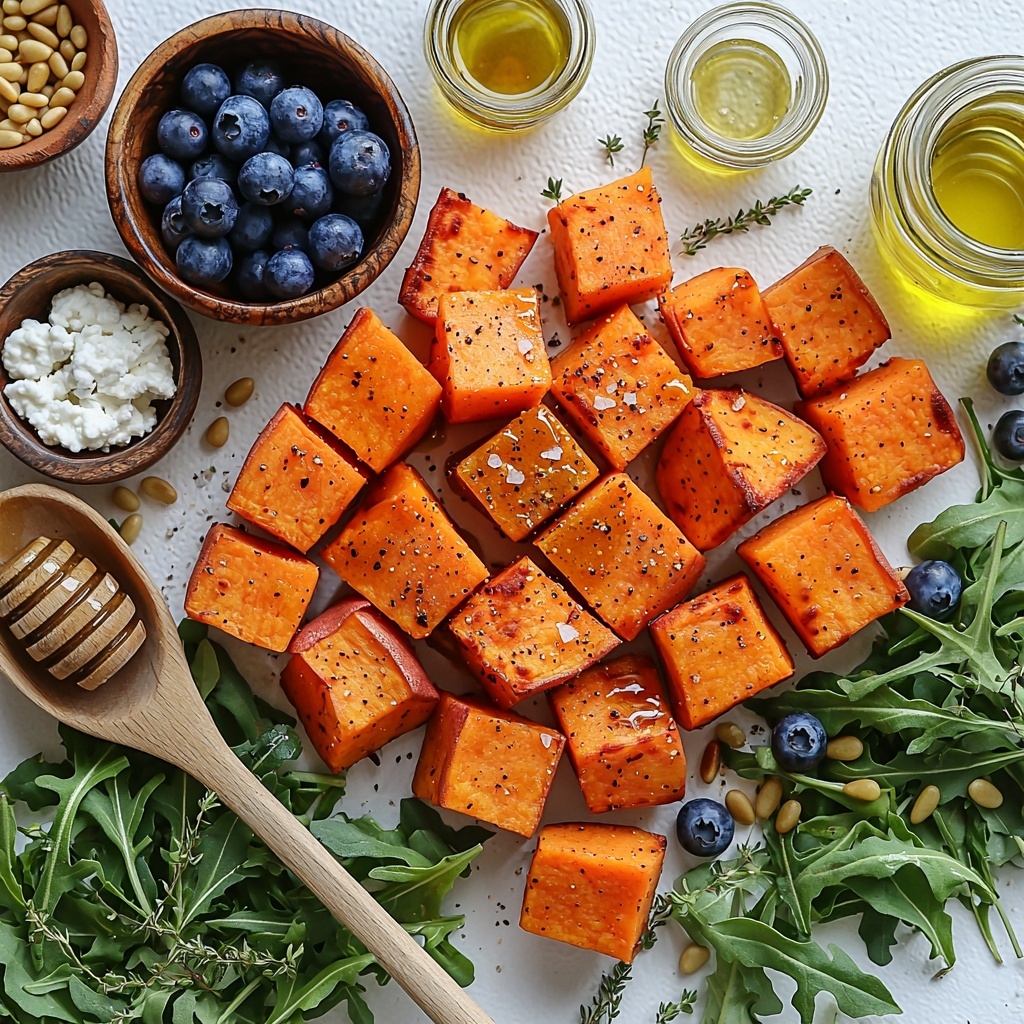 A vibrant and nutritious Honey Sweet Potato Summer Salad featuring roasted sweet potatoes tossed with fresh arugula, juicy blueberries, tangy goat cheese, and crunchy nuts, all brought together with a sweet and zesty honey lemon vinaigrette. Perfect as a light lunch or side dish, this salad combines natural sweetness with fresh, savory flavors for a refreshing summer delight.