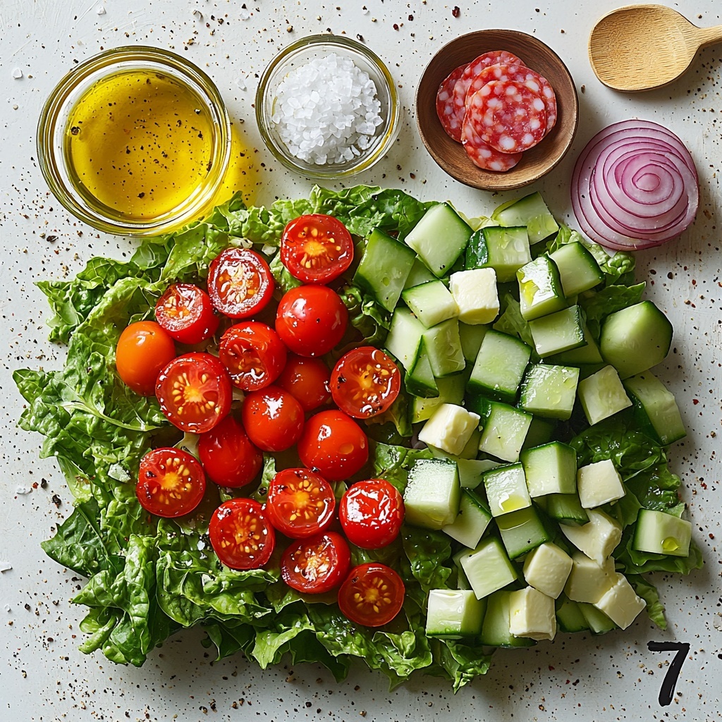 1. Prepare the salad base: In a large bowl, combine the chopped romaine, peeled and cubed English cucumber, halved cherry tomatoes, and sliced red onion. This mix forms the crisp foundation of the Italian chopped salad.