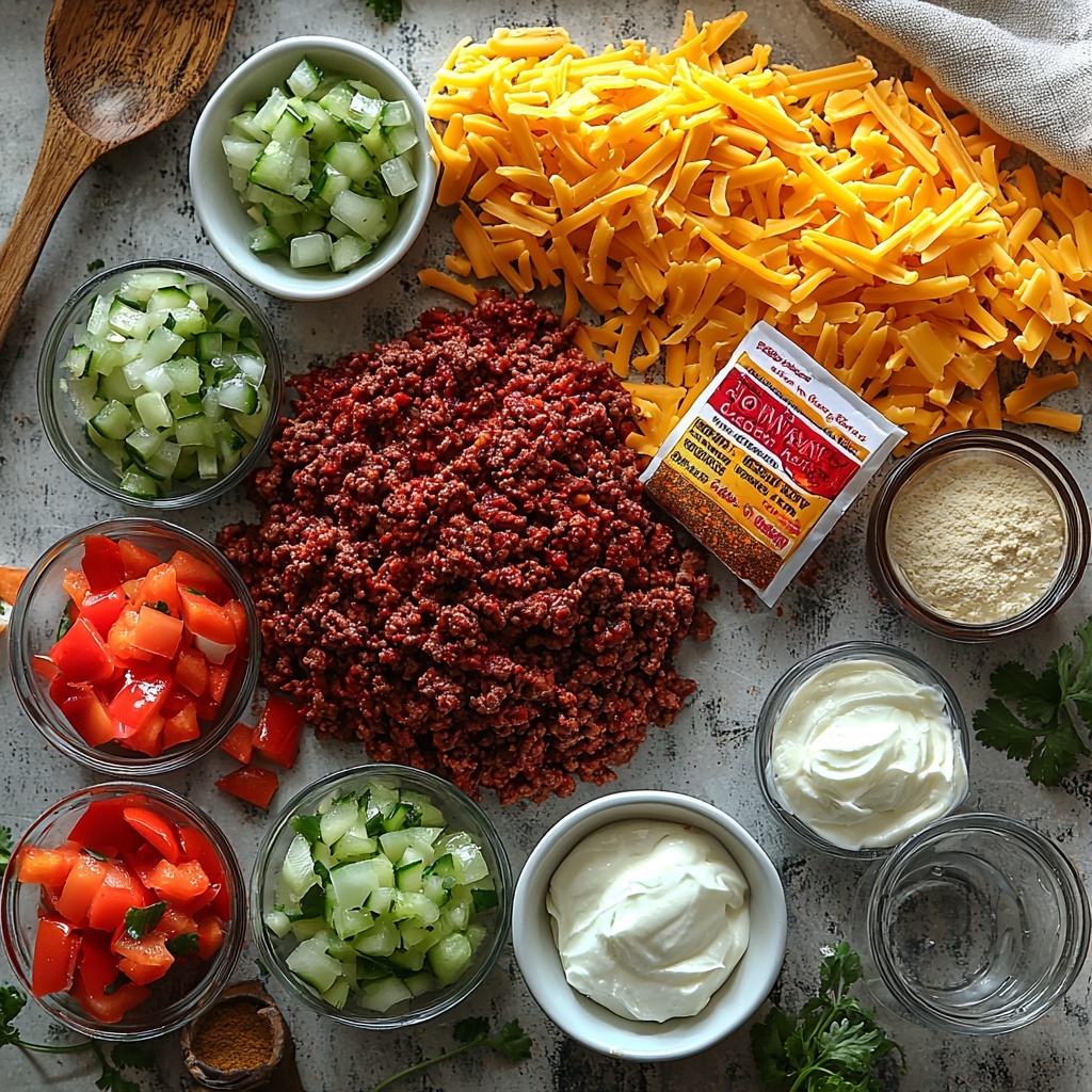 These ingredients are surprisingly simple but each plays a crucial role in building the rich, savory, and creamy layers of this casserole. From the flavorful taco-seasoned beef to the tangy cheese and smooth biscuit base, every component contributes uniquely to the vibrant character of this dish.
