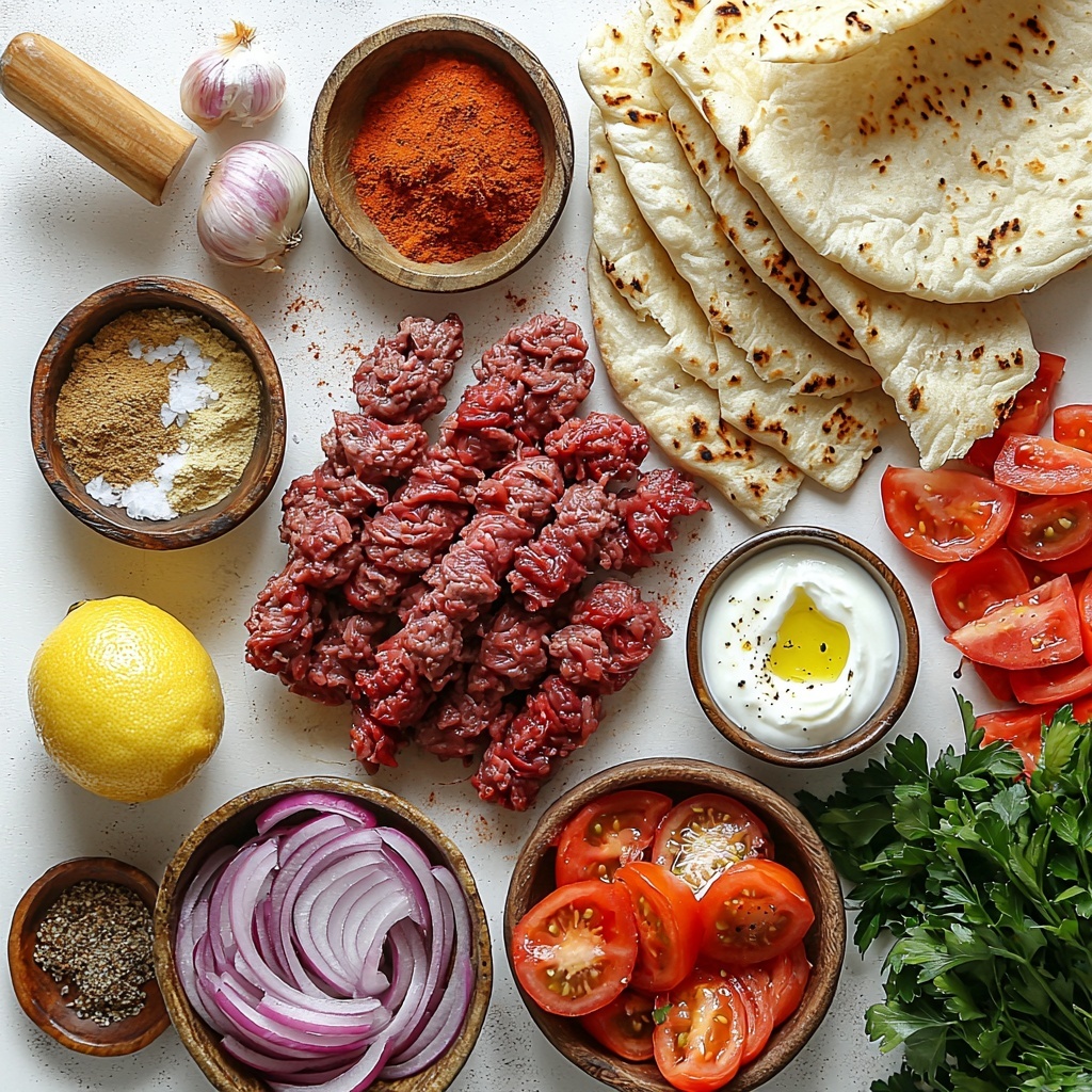 These Juicy Oven-baked Kebabs feature a flavorful blend of ground beef or lamb seasoned with aromatic spices and herbs, baked to perfection with crisp edges. Served with tangy sumac onions, creamy garlic yoghurt sauce, fresh tomatoes, and warm flatbreads, this recipe offers a delicious and easy-to-make Middle Eastern-inspired meal perfect for gatherings or weeknight dinners.