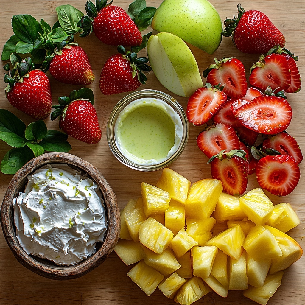 - Fresh fruits for dipping (strawberries, pineapple, apple slices): Adds natural sweetness and crunch—perfect vehicles for the dip.