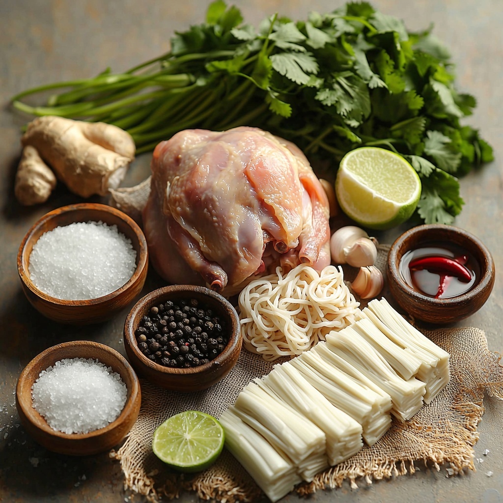 The beauty of this Lao Chicken Noodle Soup Recipe lies in its simple yet incredibly flavorful ingredients. Each component adds a layer of authenticity and texture—from the fragrant ginger and garlic that create the soup’s aromatic base, to the fresh herbs and lime that bring brightness and lift to every bite. These essentials work together to deliver a taste that’s both comforting and refreshingly vibrant.