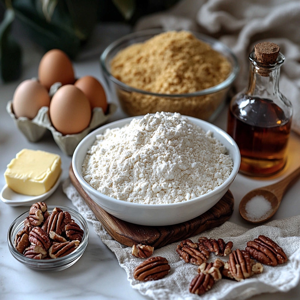 This Lazy Girl Pecan Pie Bars Recipe relies on a handful of pantry staples that, when combined, create a perfect balance of flavors and textures. Each ingredient plays a key role, whether it’s the flaky crust or the sticky-sweet filling, making these bars irresistible from the first bite to the last.