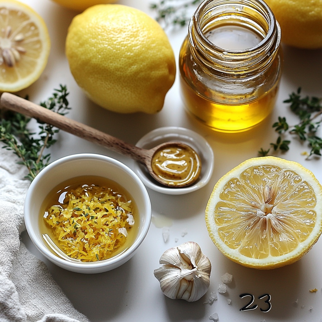 - Combine Ingredients: In a high-speed blender or mini-food processor, combine lemon juice, lemon zest, honey, Dijon mustard, garlic, thyme, and salt. Blend or pulse the mixture until it is well mixed and uniform.