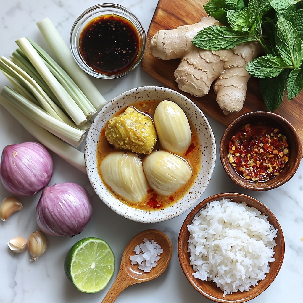 The magic of this Lemongrass Broth Bowls with Yellow Curry Chicken Recipe lies in its simple but essential ingredients. Each one plays a key role in building layers of flavor, from the aromatic lemongrass to the creamy coconut milk, ensuring the dish is perfectly balanced in taste, texture, and color.