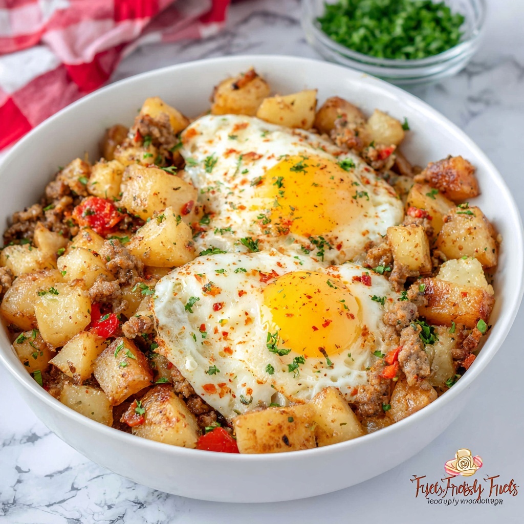 This Delicious Loaded Breakfast Hash is a hearty and flavorful morning dish featuring golden crispy potatoes, savory breakfast sausage, caramelized bell peppers and onions, all topped with perfectly fried eggs and fresh parsley. Ideal for a filling family breakfast or brunch, this skillet-cooked hash brings together simple ingredients with bold seasoning for a satisfying start to your day.