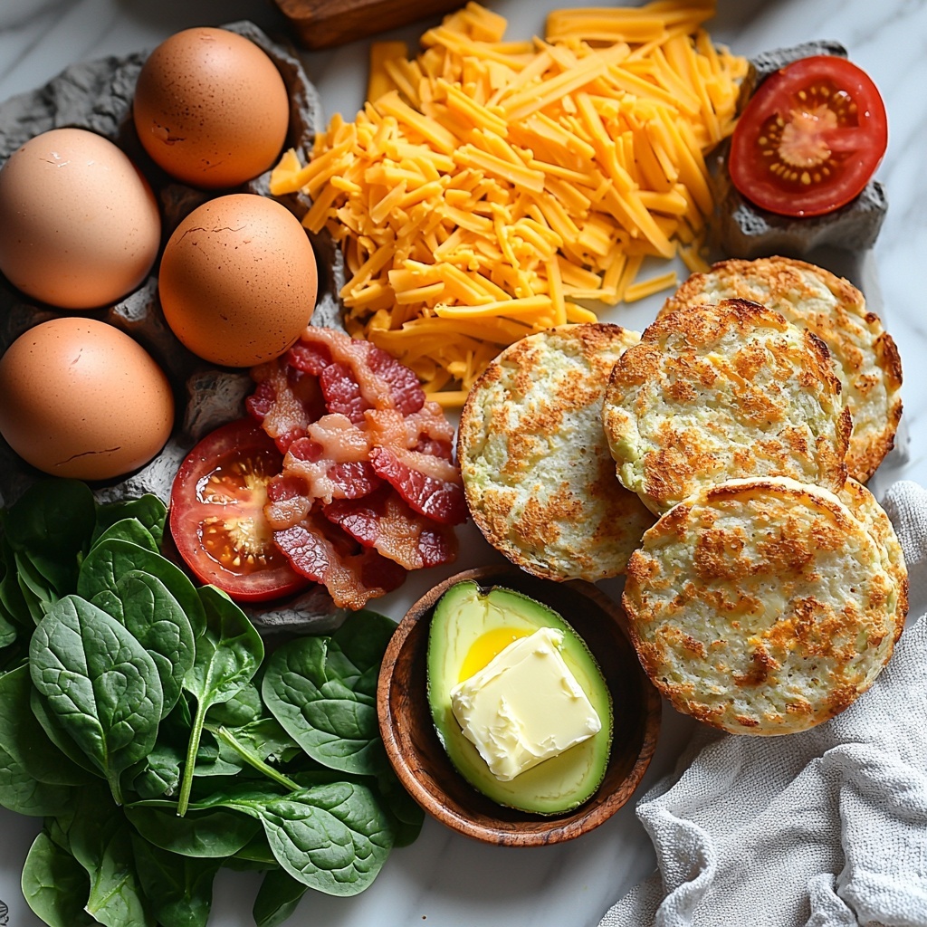 - Assemble Sandwiches: Place each bacon-and-cheese topped egg onto the avocado-spread English muffin halves. Add 2 tablespoons of baby spinach on top, followed by a slice of tomato. Finish by placing the muffin tops on each sandwich. Serve immediately.
