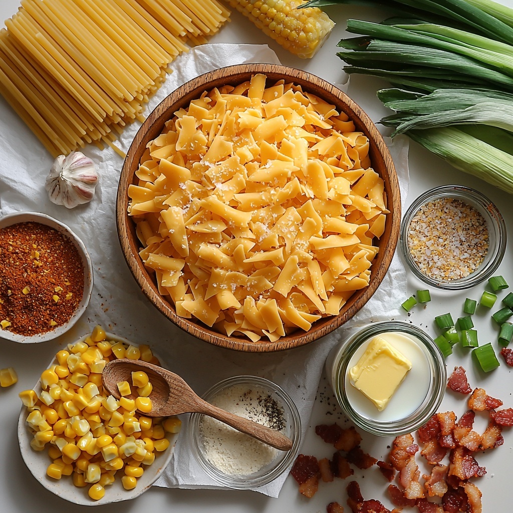 - Make Cheese Sauce: While the pasta cooks, melt 3 tablespoons of butter in a large skillet over medium-low heat. Whisk in the flour and continue cooking for 1-2 minutes until the mixture thickens and takes on a lightly golden color. Gradually whisk in the warmed milk and cook the sauce for 3-5 minutes until thickened. Remove from heat and stir in the shredded cheddar and Swiss cheeses until melted. Add dry mustard, pressed garlic, cayenne pepper, paprika, white pepper, salt, black pepper, and crumbled bacon. Once everything is combined, fold in half of the chopped scallions and all of the frozen corn.