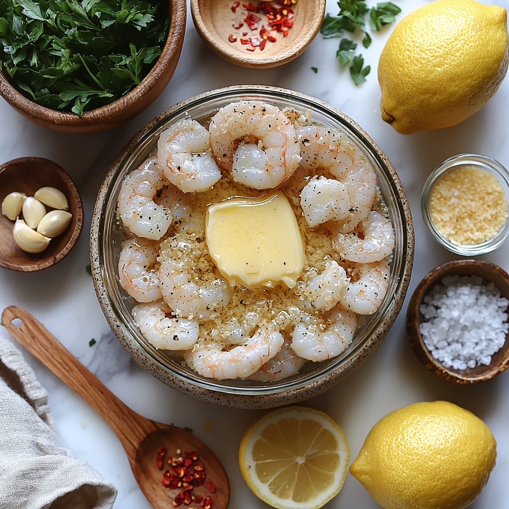 - Prepare Shrimp Mixture: In a large bowl, combine the melted butter, minced garlic, red pepper flakes (if desired), lemon juice, salt, and black pepper. Toss the peeled and deveined shrimp in this flavorful mixture, making sure each piece is fully coated for enhanced taste.