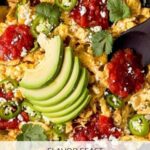 When ready to eat, gently reheat leftovers in a nonstick skillet over medium heat to preserve the scramble’s texture and prevent it from becoming rubbery. Add fresh avocado slices and garnish afterward to brighten it back up.