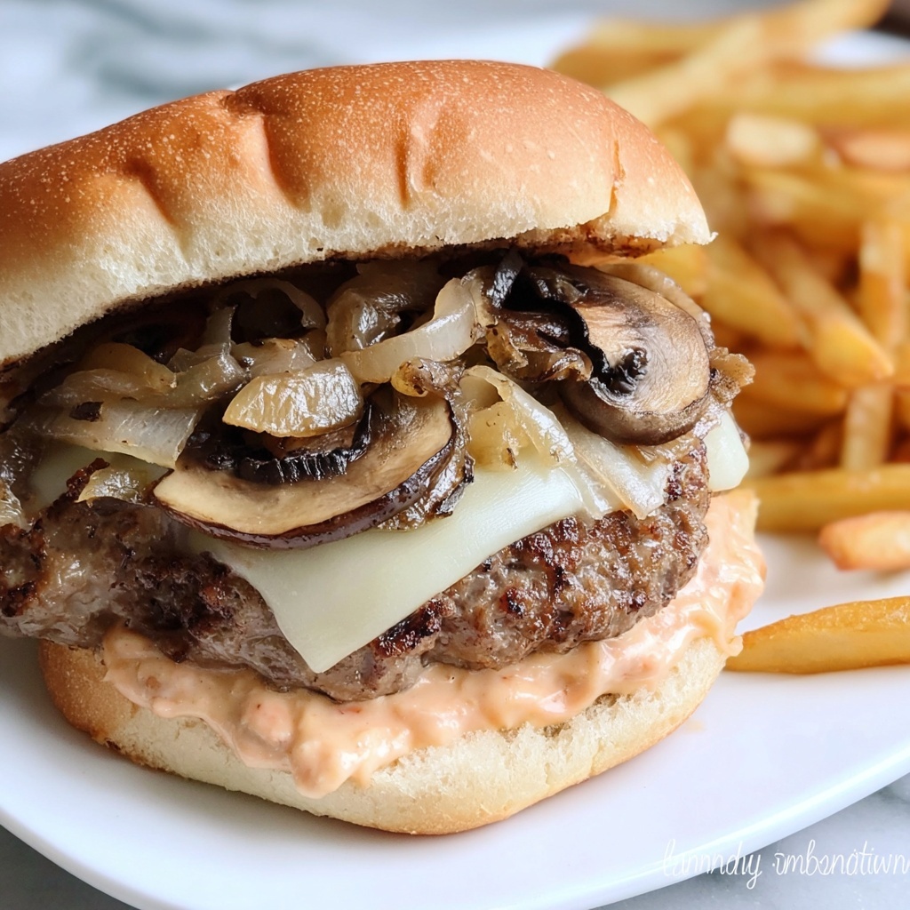 A delicious Mushroom Swiss Burger recipe featuring juicy grilled beef patties topped with savory sautéed baby bella mushrooms and melted Swiss cheese, served on toasted brioche buns. Ready in 30 minutes, this hearty and flavorful burger is perfect for a satisfying dinner or weekend cookout.