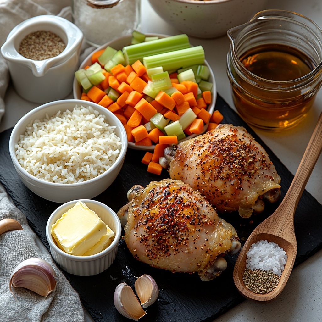 A comforting and flavorful one-pan chicken and rice bake featuring tender chicken thighs cooked atop savory mirepoix-infused rice in a cozy oven bake. This easy recipe delivers a complete meal with minimal cleanup, perfect for busy weeknights.