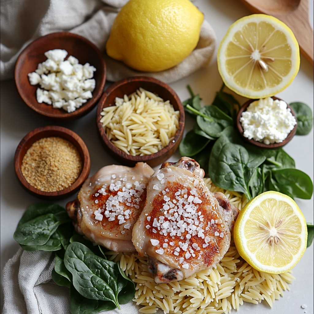 A flavorful one-pan Greek-inspired dish featuring juicy bone-in chicken thighs roasted with aromatic herbs and spices, combined with tender risoni pasta cooked in lemony chicken stock. Finished with fresh spinach, parmesan, and optional feta, this recipe offers a comforting, easy-to-make meal packed with Mediterranean flavors.
