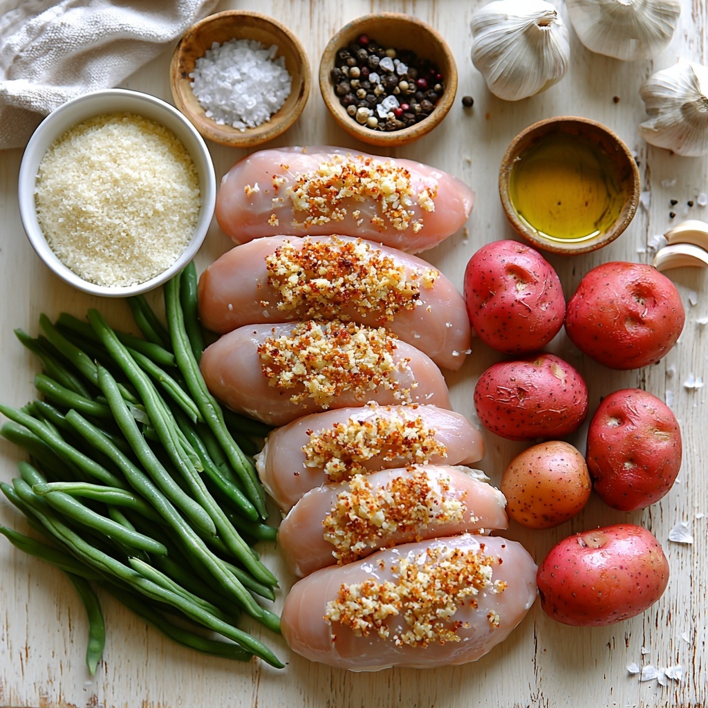 Every ingredient in this Parmesan Crusted Chicken Sheet Pan Dinner Recipe plays a crucial role, creating a balance of flavors and textures that feel both hearty and fresh. From the crispy Parmesan crust to the garlic-infused roasted potatoes and vibrant green beans, each component is simple but essential to making this dish shine.