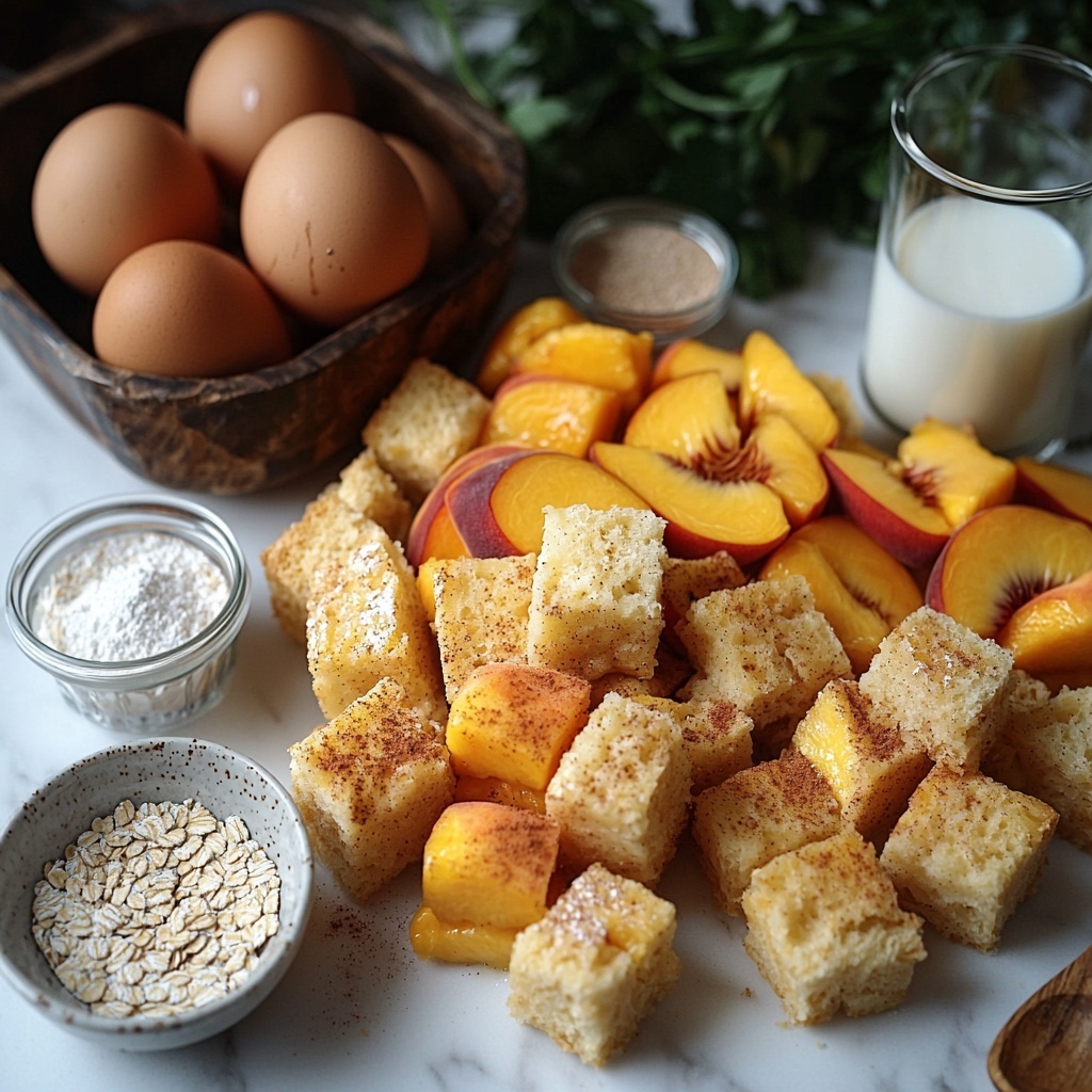 The charm of the Peach Cobbler French Toast Bake: Golden, Creamy Bliss! Recipe lies in its straightforward ingredients that come together beautifully. Each item plays a crucial role; from the soft brioche that soaks up the custard perfectly, to the fresh peaches that add natural sweetness and juiciness, and the spiced topping that brings in texture and warmth. Here’s what you’ll need: