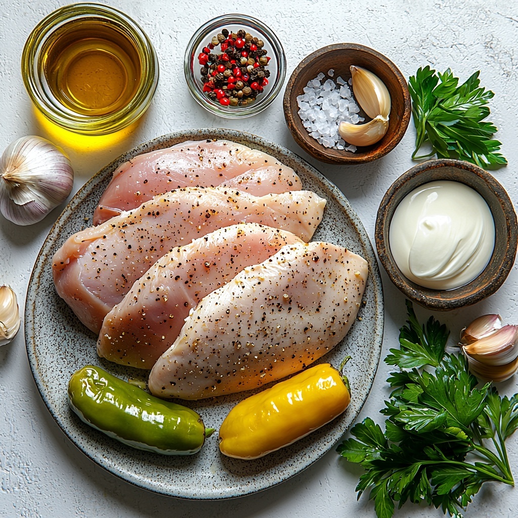 Start by drying your chicken breasts with paper towels so that they brown beautifully. Then sprinkle them liberally with salt and black pepper—seasoning is what brings out the best flavors here. Meanwhile, chop your yellow onion, mince the garlic, and get those pepperoncini peppers drained and roughly chopped. Having everything prepped means cooking will be a breeze.