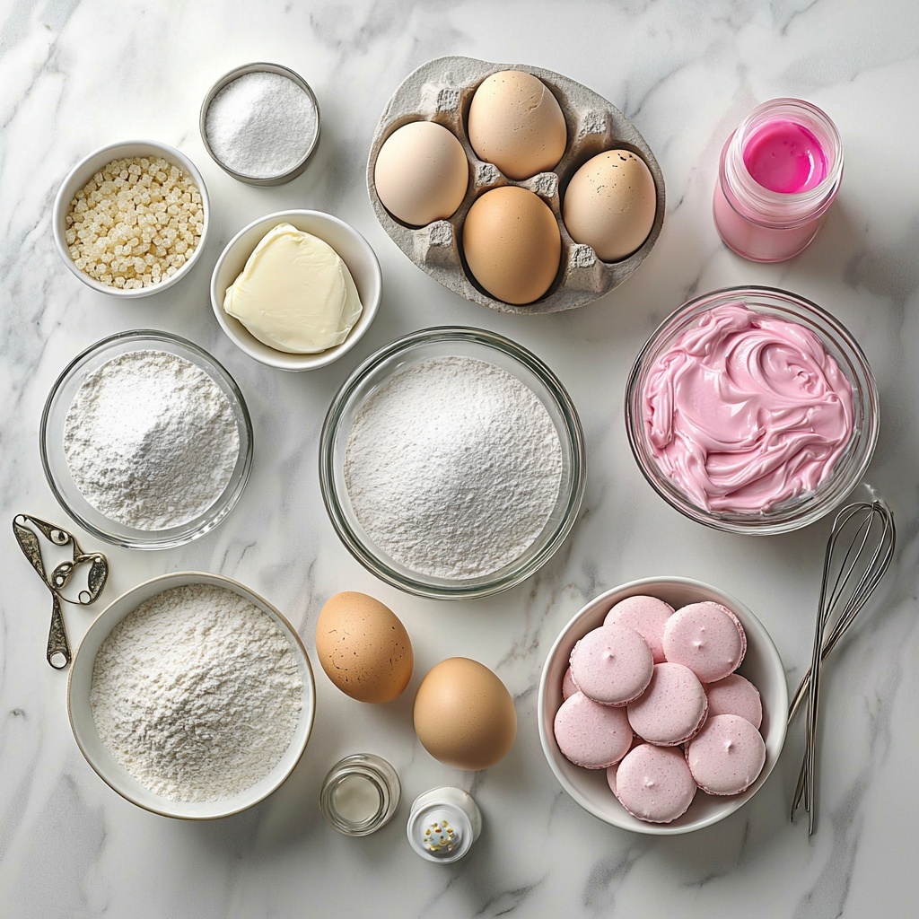 Keep it simple yet essential with these ingredients that each play a pivotal role in perfecting texture, flavor, and that inviting pink color you want your macarons to have. Every element has its moment to shine and create this delicate balance of sweet and creamy perfection.