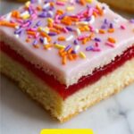 These Poptart Cookie Bars combine the nostalgic flavor of classic poptarts with the rich chewiness of cookie bars. Layers of buttery cookie dough sandwich a sweet strawberry preserves filling, topped with a smooth vanilla glaze and colorful rainbow sprinkles. Perfectly golden and irresistibly indulgent, these bars make a delightful treat for any occasion.
