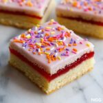 These Poptart Cookie Bars combine the nostalgic flavor of classic poptarts with the rich chewiness of cookie bars. Layers of buttery cookie dough sandwich a sweet strawberry preserves filling, topped with a smooth vanilla glaze and colorful rainbow sprinkles. Perfectly golden and irresistibly indulgent, these bars make a delightful treat for any occasion.
