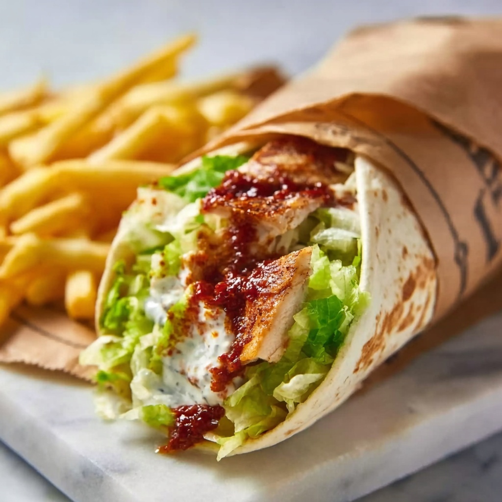 Nothing pairs better with this wrap than crispy fries, especially air-fryer chips or oven-baked fries that keep the meal light and crunchy. A simple side salad with a lemon vinaigrette or some pickled vegetables can offset the heat and add a crisp contrast.
