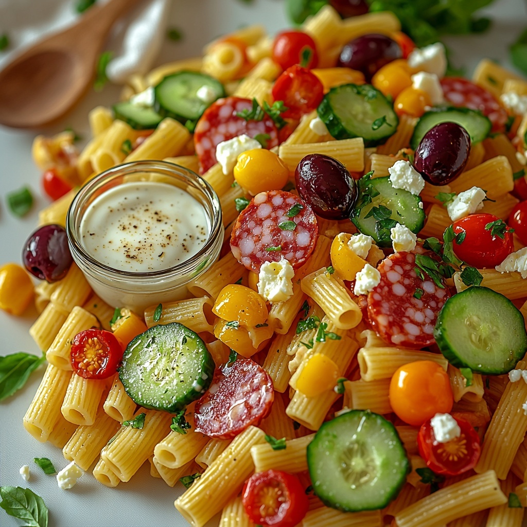 Protein Pasta Salad with Feta, Salami, and Greek Yogurt Dressing Recipe