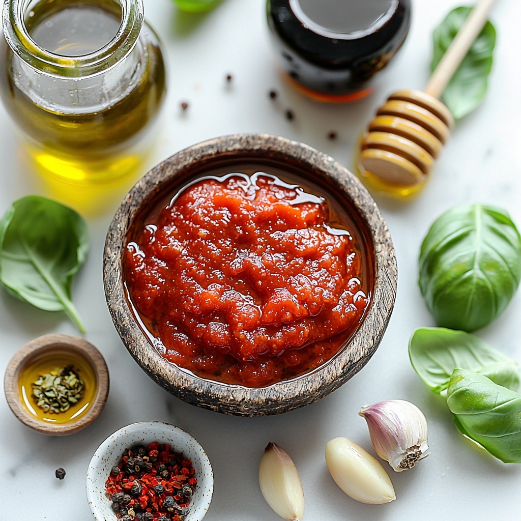 This quick and flavorful homemade tomato sauce is perfect for pasta, pizza, or as a dipping sauce. Made with simple ingredients like garlic, dried herbs, and a touch of balsamic vinegar and honey to balance acidity, this versatile sauce simmers to develop rich, classic Italian flavors. Easy to prepare on the stovetop, it can be customized with optional red pepper flakes for a spicy kick and finished with fresh basil for an aromatic touch.