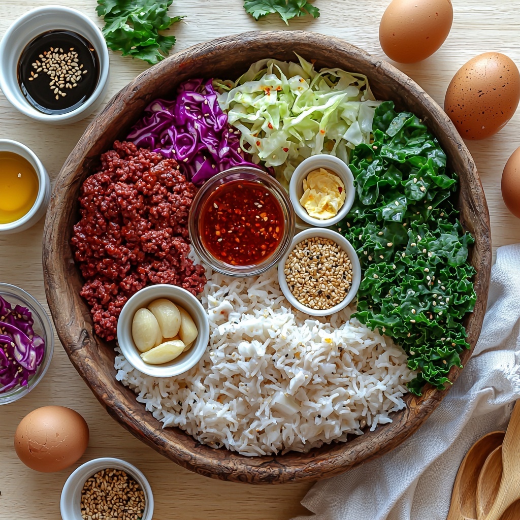 Spoon about 1 cup of the warm rice into each of 4 bowls. Evenly divide the saucy ground beef over the rice and add a generous handful of the cabbage and greens mixture to one side. Top each bowl with a perfectly cooked egg, then sprinkle sliced green onions and toasted sesame seeds for that final burst of flavor and texture.