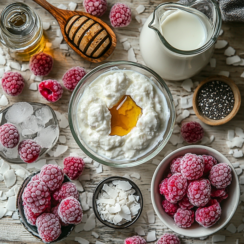- Combine Ingredients: Add the frozen raspberries, coconut milk, coconut water, Greek yogurt, honey or maple syrup, shredded coconut, chia seeds, vanilla extract, and ice cubes to a high speed blender.