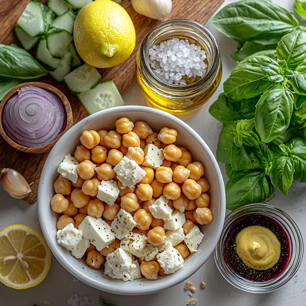 - Prepare the Salad Ingredients: Rinse and drain the canned chickpeas thoroughly to remove excess liquid. Dice the large English cucumber and red onion into bite-sized pieces. Crumble the feta cheese and chop any fresh herbs you plan to use for added aroma and color.