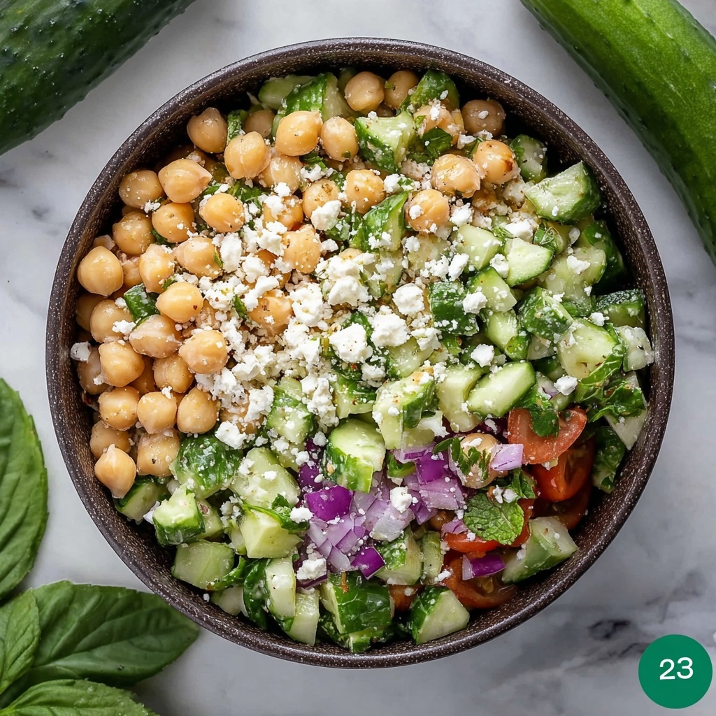 This Refreshing Chickpea Feta Cucumber Salad is a healthy, vibrant meal prep option packed with protein-rich chickpeas, creamy feta cheese, crisp cucumber, and a zesty lemon-herb dressing. Perfectly chilled and tossed together, it offers a delightful balance of flavors and textures, ideal for a light lunch or side dish.