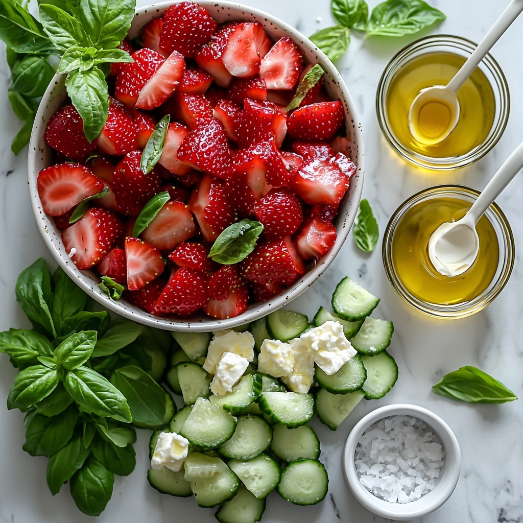 The magic of this Refreshing Strawberry Cucumber Salad with Feta Bliss Recipe lies in its simple yet thoughtful ingredients. Each one plays a crucial role—from the sweetness and juiciness of the strawberries to the herby freshness and creamy feta that rounds out every bite with richness. Having these essentials on hand will make putting together this salad a breeze and guarantee a flavorful result.