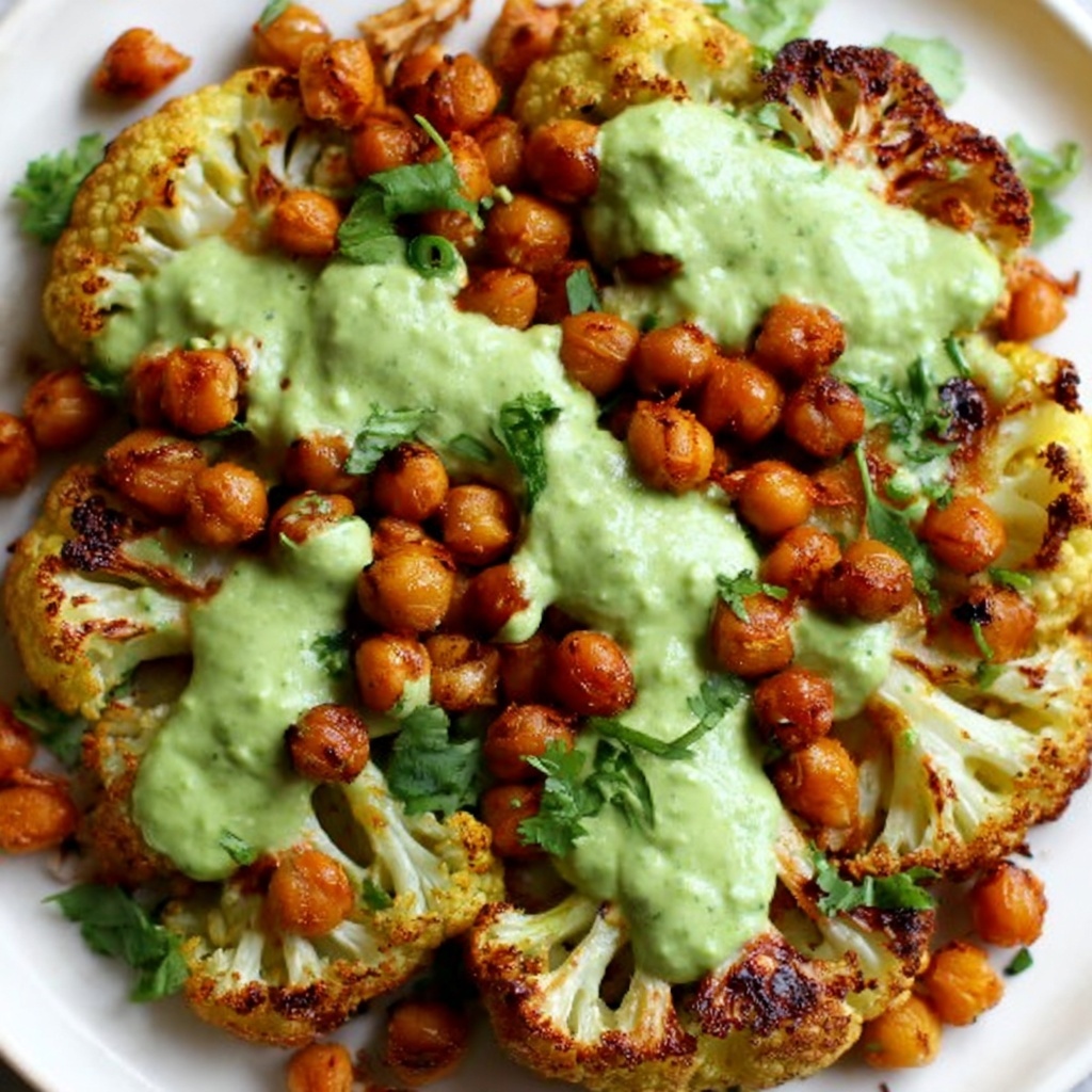 A flavorful and healthy Roasted Cauliflower and Chickpeas dish, enhanced with a smoky spice blend and topped with a creamy, fresh herby tahini sauce. This easy-to-make recipe is perfect for a wholesome vegetarian meal, combining crispy roasted vegetables and protein-rich chickpeas with bright, herbaceous flavors.