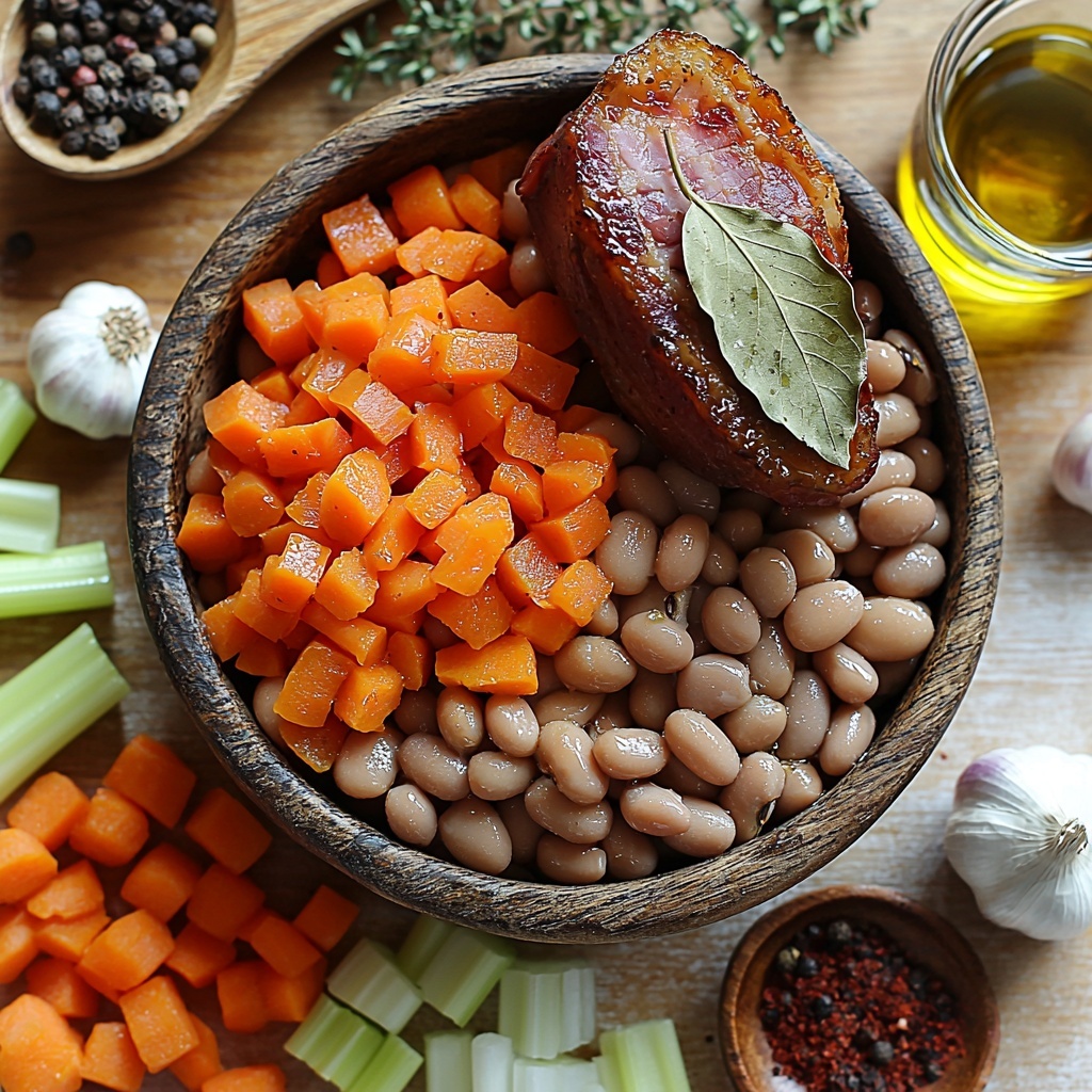 Gathering simple, wholesome ingredients is the first step to creating the rich, comforting flavors of this recipe. Each item contributes its own unique touch—from the creamy texture of the beans to the smokiness of the ham, and the subtle warmth of herbs and spices that transform this dish from plain to absolutely delicious.