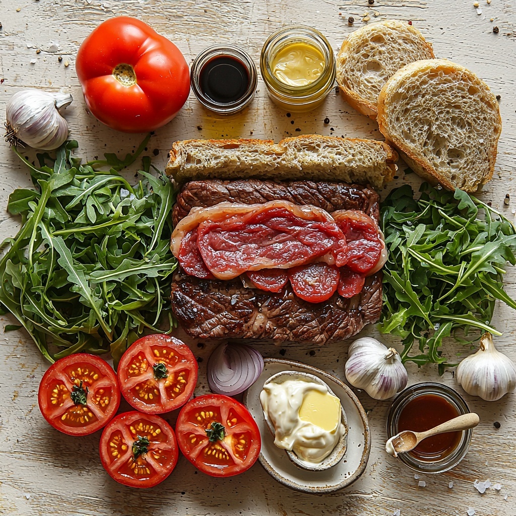 - Assemble Sandwich: Layer fresh rocket leaves, sliced tomatoes, the sliced steak, and caramelized onions inside the bread. Drizzle with mustard for a tangy finish.