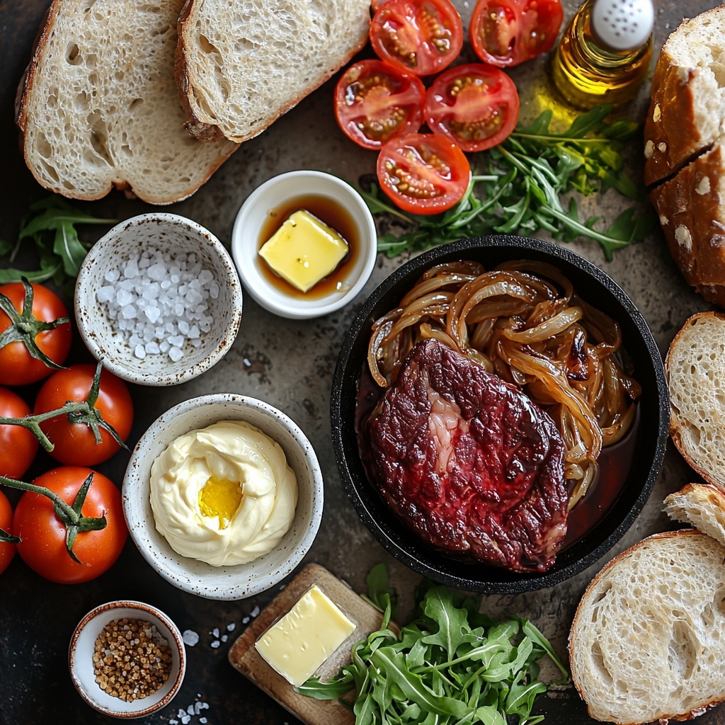 A delicious savory steak sandwich featuring tender Bavette beef, sweet caramelized onions, and a creamy garlic aioli, all layered on Turkish bread with fresh rocket and tomatoes. Perfectly balanced flavors and textures make this sandwich a satisfying meal that showcases classic techniques like searing and slow caramelizing.